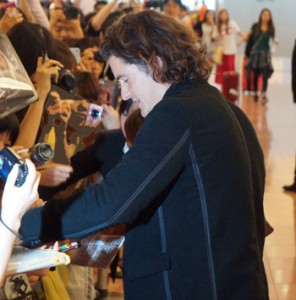 この日、早朝の空港のロビーには女性を中心に約300人以上のファンが詰めかけた。集まったファン達から黄色い大声援が上がるや、サインや写真撮影に応じた。公式来日は映画『パイレーツ・オブ・カリビ アン/ワールド・エンド』以来7年ぶりとあってひとりひとりに対して丁寧なファンサービスに努めていた。27日午後には来日会見に出席する。