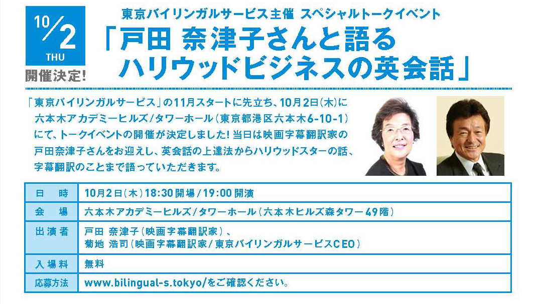 このトークイベントは「東京バイリンガルサービス」のスタートを記念して開催されるため、当日は映画字幕翻訳家の戸田さんが、英会話の上達法からハリッドスターの話、字幕翻訳のことまで語る予定。