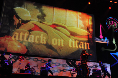 「進撃の巨人」パートは梶裕貴(エレン・イェーガー役)、石川由依(ミカサ・アッカーマン役)の生アフレコでスタート。透過性スクリーンを用いた特殊な立体映像演出により、ライブ会場は作品の世界観の中にひきこまれた。最中、リヴァイ役の神谷浩史が突如サプライズ登場し、会場は大歓声の渦に。さらに巨大スクリーンの奥から、Linked Horizon がサプライズ登場。オープニング曲の「紅蓮の弓矢」「自由の翼」、Sound Horizon 名義での新曲「よだかの星」を披露。