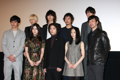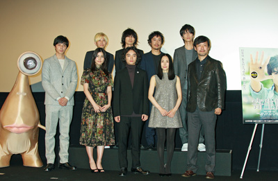 映画『寄生獣』は、人間に寄生し擬態し、人間を捕食する新種の寄生生物が出現したことで、人間が食物連鎖の頂点に立つ時代は突然終わった世の中。高校生の泉新一と、彼の右手に寄生したミギーによる奇妙な友情と戦いの物語。登壇者のほかに北村一輝、大森南朋、余貴美子、ピエール瀧、新井浩文、國村隼、浅野忠信、阿部サダヲが出演している。