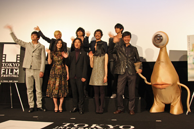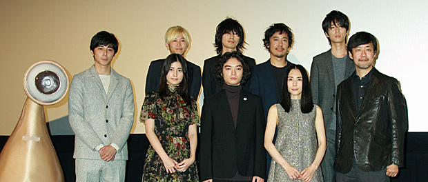 [シネママニエラ]第27回東京国際映画のクロージング作品『寄生獣』がワールドプレミア上映され、完成披露試写会も兼ねた舞台あいさつが10月30日、東京のTOHOシネマズ六本木ヒルズにて行われた。この日は、主演の染谷将太、橋本愛、深津絵里、東出昌大、そして山崎貴監督が登壇し、また本作の主題歌「パレード」を書き下ろした4人組ロックバンドのBUMP OF CHICKENもサプライズで登場し大歓声を浴びた。
