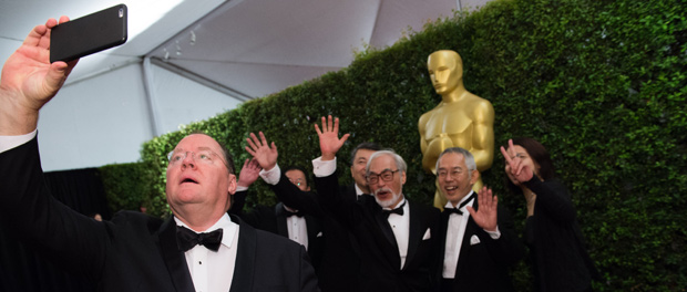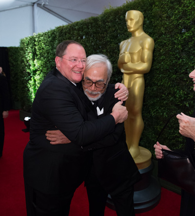 ディズニー映画のジョン・ラセターも自分のことのように大喜びで、自撮り写真を撮るさいもご覧のようにノリノリだった。もちろん鈴木敏夫プロデューサーも同行している。