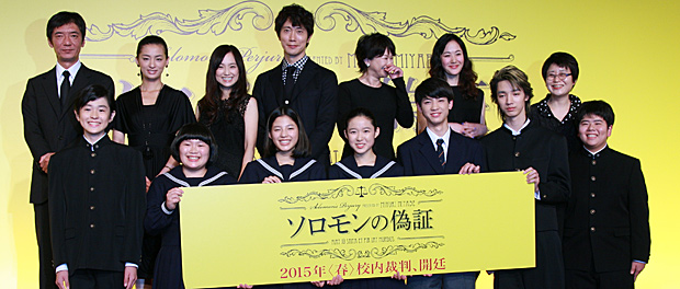 [シネママニエラ]映画『ソロモンの偽証』製作報告会見が11月12日に都内で行われた。会見に出席したのは、藤野涼子、板垣瑞生、石井杏奈、清水尋也、富田望生、前田航基、望月歩、佐々木蔵之介、夏川結衣、永作博美、黒木華、尾野真千子、成島出監督、宮部みゆき(原作者)の総勢14名。題材でもある裁判に絡めて、この日の会見では報道陣が着席する会場の一角には、傍聴人席という張り紙が。そして、会場全体が見渡せる席には、スケッチブックを広げた法廷画家の姿も見受けられた。
