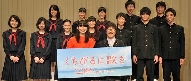 [シネママニエラ]女優の新垣結衣が主演をつとめる映画『くちびるに歌を』の完成披露試写会が1月14日に東京・イイノホールにて開催され、新垣と三木孝浩監督、そして12名の生徒役が舞台あいさつに登壇した。