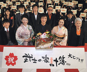 [シネママニエラ]加賀藩に仕える御算用者(経理係)の暮らしぶりを描いた新書を原作にした時代劇映画『武士の家計簿』が、12月4日に公開となり、監督と出演者一同が縁起ものの鯛(色)でヒットを祝した。