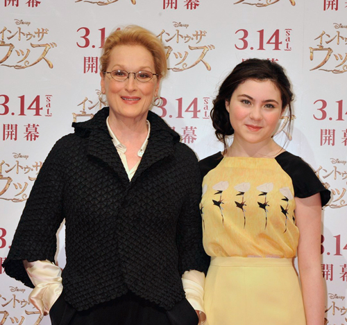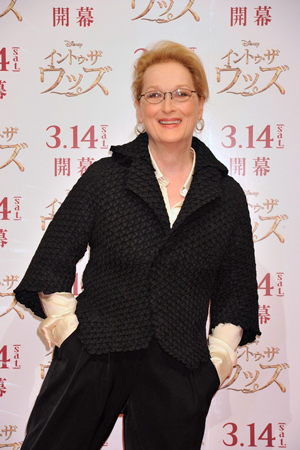 そのメリルだが初の魔女役に臨んだ気持ちを「(年齢を重ねたことで)いじわるになったからよ」などとユーモアたっぷりに語った。それにソンドハイムの楽曲は「素晴らしい歌詞と美しい旋律が最大の魅力」と分析し、「オオカミ役のジョニー・デップの歌唱はとてもチャーミング。才能豊かな彼ならでは」と称えた。このときに通訳がオオカミをウルフと訳したところ、メリルは「日本語もウルフなの?」と探求心を垣間見せた。