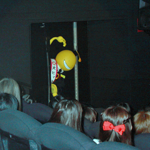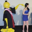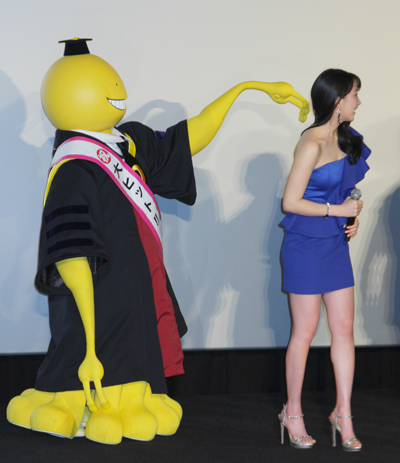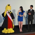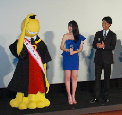 この模様は、全国114スクリーンで生中継された。登壇者は各自の出身地に向けそれぞれメッセージ。そんな登壇者を驚かせたのは、舞台あいさつの後半でのこと。着ぐるみの殺せんせー(ころせんせー:触手のある黄色いキャラクター)が触手を操りつつ軽やかに舞台の下手から登場。そちらに注目を集める中、舞台反対の上手には二宮の姿が。山田や菅田が「今日の殺せんせーの動きはシャープだね」などと印象を述べるや、二宮が「本当だね」と応答。監督を除いた登壇者は、本作への二宮の関与を知らされておらず、見事サプライズに成功した。