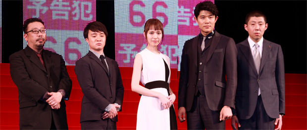 [シネママニエラ]俳優の生田斗真が主人公のゲイツを演じ、筒井哲也著のコミックを映画化した『予告犯』の完成披露試写会が4月21日に都内のホールで開催され、生田をはじめ、戸田恵梨香、鈴木亮平、濱田 岳、荒川良々、中村義洋監督が上映前の舞台あいさつを行った。登壇者は作品の完成度に絶対の「自信」を見せており、なかでも生田は自信・自信作と何度も口にした。鈴木によると、生田とは試写鑑賞のあとにメールで「すげぇ面白かった!」といった感想のやりとりをするほどだったという。
