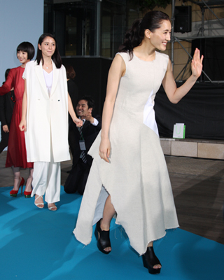 この日は、大人キャストの大竹しのぶ、風吹ジュン、リリー・フランキー、それに是枝監督も出席。監督の前作『そして父になる』でカンヌ映画祭を訪れている、リリーは「残念ながらわたしは今回連れて行ってもらえないので。日本を代表する女優として露出多めのドレスで!」と4姉妹を演じた女優にリクエスト。その発言に対して、まだ10代の広瀬が驚き顔を見せると「でも、すずは(露出しなくて)いいからね」と気遣った。