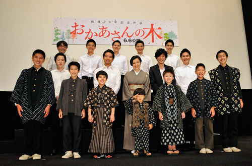 [シネママニエラ]女優の鈴木京香が主演映画『おかあさんの木』の完成披露試写会舞台あいさつに出席した。桐(きり)柄の着物姿の鈴木はフォトセッションで、劇中で我が子を演じた14名に囲まれるとニッコリと母の顔をのぞかせた。鈴木の子ども役・青年期の三浦貴大、細山田隆人、大鶴佐助、大橋昌広、石井貴就、安藤瑠一、西山 潤、幼少期の永峯海大、溝口太陽、工藤大空飛、阿部大輝、高木煌大、戸塚世那、加藤瑛斗。