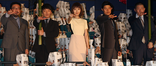 舞台あいさつには、戸田恵梨香、鈴木亮平、濱田岳、荒川良々、中村義洋監督が登壇。司会の生田による案内で登壇し、檀上で「予告」達成の検証を実施。戸田は整体に5回通うなどの努力の甲斐むなしく身長測定(163→165センチで達成)は-0,5センチという結果に。監督の減量もわずかに及ばず。荒川は結婚宣言し婚活を試みたが実は結ばず。濱田も全国プロモーション及び66媒体の取材と頑張ったが、生田が153媒体ということで、中村監督の「(濱田くんは)もっと頑張れたはず」という判定で未達成。予告の詳細はこちらの記事で