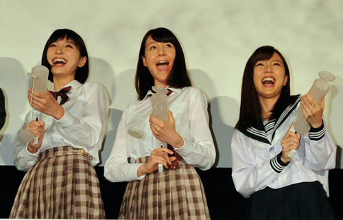 [シネママニエラ]映画『リアル鬼ごっこ』でトリプルヒロインを務める、トリンドル玲奈、篠田麻里子、真野恵里菜が、園子温監督の現場を振り返った。衣装の女子高生(以下、JK)の制服姿はミニスカートなのだが、この日は久々に着用。ネタバレを避けるために、園監督の厳重監視のもとでのコメントとなった。園監督は「単純にジェットコースタームービーなんで急降下でどこまでも行っちゃいます。楽しんで下さい」とコメントを寄せた。