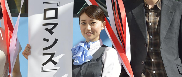 「みなさま、本日は小田急ロマンスカーをご利用下さいまして誠にありがとうございます。8月29日公開の映画『ロマンス』で、ロマンスカーアテンダント北條鉢子役を演じています大島優子です。この映画はロマンスカー、そして箱根の景勝地を巡るプチ・トリップ・ムービーで箱根の魅力はもちろん、少し肩の力を抜いてリフレッシュできる作品に仕上がりました。ぜひご覧ください。それでは映画館でお待ちしております。大島優子でした」