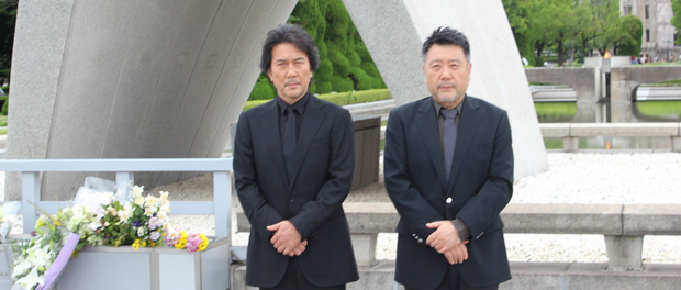役所広司と原田眞人監督が広島の平和記念公園慰霊碑に献花