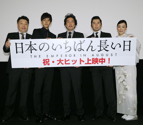 主人公・阿南惟幾陸相を演じた役所が「本日は暑い中、たくさんある映画の中でこの映画を選んで下さりありがとうございます」。昭和天皇役の本木は「ふだん私の仕事に興味を持たない17歳の息子が、珍しく『この映画は観たい』とのことで、実は今(舞台挨拶直前の上映回を)観ておりました。どんな感想が聞けるのか、楽しみにしております(笑)」とコメント。