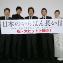 神妙な面持ちで聞いていた役所は「日本の未来を信じて戦争を戦った方と、戦争に終止符を打つのに尽力された方が、いまのこの日本に満足してくれているかどうかはわかりませんが、その方たちによって生かされているということは明らかで、この映画に参加させていただき実感いたしました。阿南さんのご子息が、この映画について語ってくださることに、本当に感謝しております」と答えた。