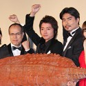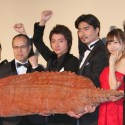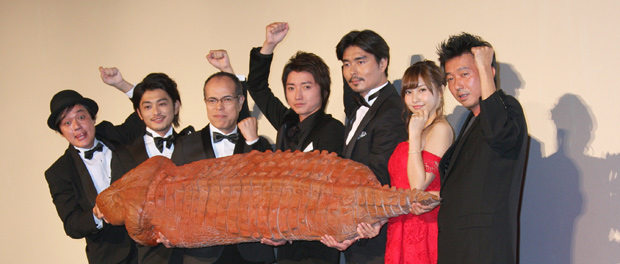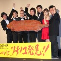 舞台挨拶の後半では、探検隊の通訳係の岡安が「六本木交差点にうじゃうじゃいたので捕獲した」という設定の体長2メートルのUMAツチノコをお披露目することに。ツチノコは即興で命名されたホソラン隊員、ヘソラン隊員のふたりに抱えられて、時折、体を震わせていたものの、おとなしく登場。藤原は冷静に「未確認物体に常に興味あり」と発して、捕獲時の話を聞き出そうとする一幕も。また、田中が思わず「劇中のワニですか?」とネタバレするほどの笑撃?!を与え、その姿に客席も沸いた。