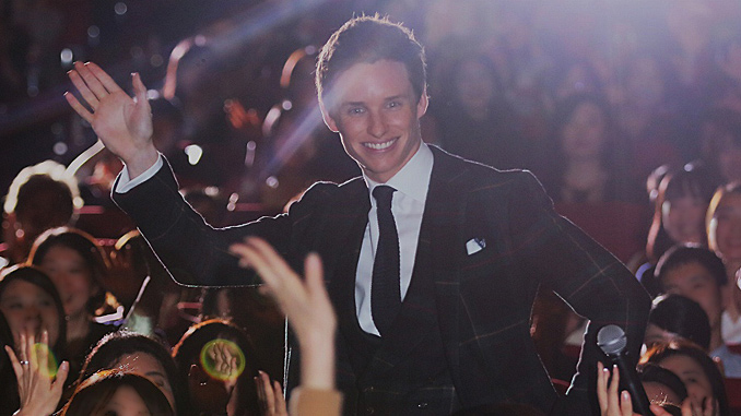 エディはラルフローレンのスーツ姿で、有楽町マリオン11Fロビーに敷かれたレッドカーペットに登場し「エディ!」の掛け声を寄せたファンに歩み寄るなど、集まったファンのサインの要求に応えた。フーパー監督も積極的なファンサービスで大いに盛り上がった。エディは「とっても興奮しているよ!」とにこやかに。そしてアレキサンダー・マックイーンの青いドレスに身を包んだ奥さまのハンナとフォトコールに応じた。その去り際には投げキッスも。