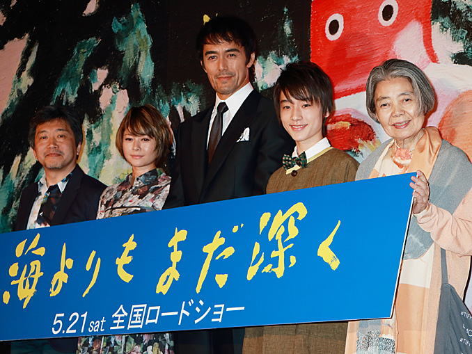 [シネママニエラ]映画『海よりもまだ深く』舞台挨拶付き完成披露試写会が4月24日に開催され、阿部寛、真木よう子、吉澤太陽、樹木希林、是枝裕和監督​が登壇した。作品のテーマである「なりたかった大人像」に言及すると、阿部の息子・真悟役を演じた吉澤は「阿部寛さんみたいな大人になりたい」と父に心酔していた。