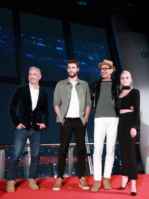 [シネママニエラ]映画『インデペンデンス・デイ:リサージェンス』来日記念会見が6月29日、東京スカイツリーの展望デッキにて行われ、<破壊王>の異名で称賛されるローランド・エメリッヒ監督、リアム・ヘムズワース、ジェフ・ゴールドブラム、マイカ・モンローが出席した。宇宙船出現の演出に大喜びのリアムに対して、高所恐怖症の監督は膝がガクガク?!