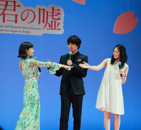 君嘘ポーズをする広瀬すずと山﨑賢人、映画『四月は君の嘘』完成披露試写会舞台あいさつにて