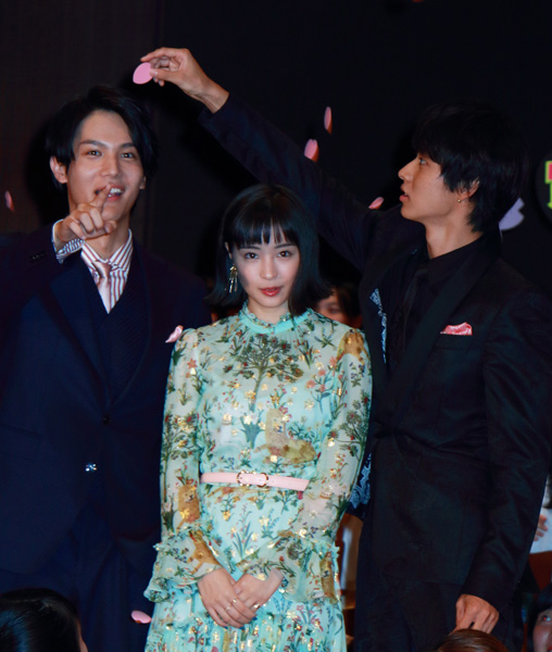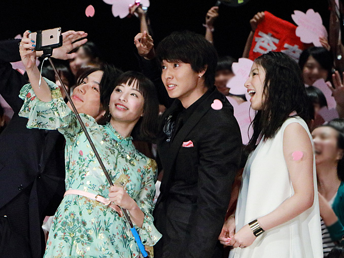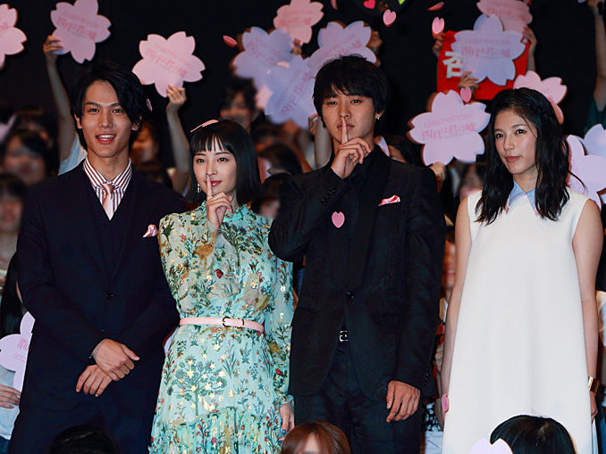 [シネママニエラ]映画『四月は君の嘘』の完成披露試写会舞台あいさつが8月3日に都内のホールで開催され、広瀬すず、山崎賢人、石井杏奈(E-girls)、中川大志、新城毅彦監督が登壇した。この日のテーマは「真夏に桜」ということでステージと客席通路に桜色カーペットを敷き、桜吹雪を散らす演出がなされた。