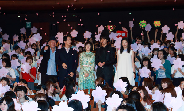 左から新城毅彦監督、中川大志、広瀬すず、山﨑賢人、石井杏奈
