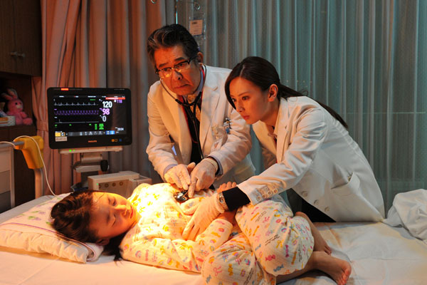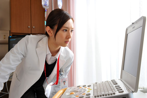 診察中の内科教授・津久場公人(古谷一行)と女性研修医・栂野真琴(北川景子)