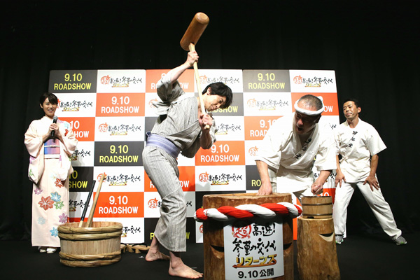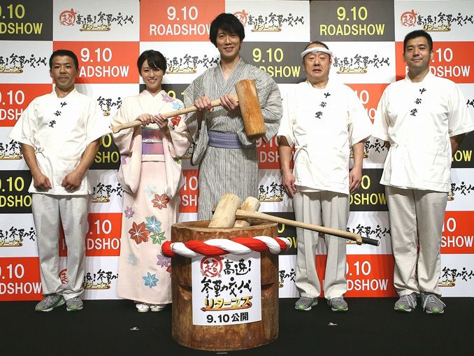 [シネママニエラ]俳優の佐々木蔵之介が主演映画『超高速!参勤交代 リターンズ』のイベントに出席し、紅葉柄の着物姿の深田恭子に見守られながら、超高速の餅つきに挑んだ。劇中では殿と姫を演じたふたり、恭子姫からはご褒美のお餅「ア~ン」があり、殿のデレデレ姿を披露した。