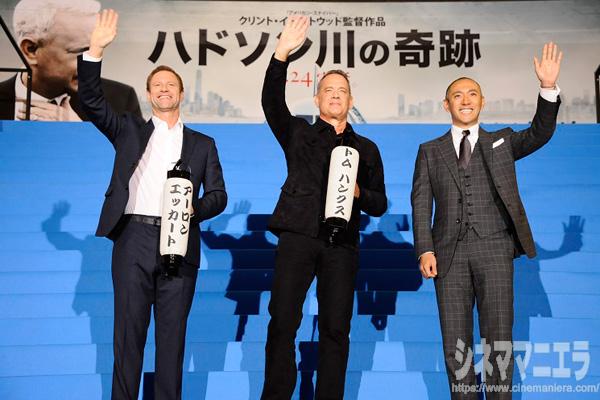 この日は、歌舞伎役者の市川海老蔵が直接映画の感想を伝えたいとして駆け付けた。海老蔵は、正しいことを正しいと証明するのがいかに難しいことなのか。トム演じるサリー機長にとても勇気を与えられる映画です」と感想を述べた。そして、カタカナで「トムハンクス」「アーロンエッカート」という名入りの提灯をふたりにプレゼント。伝統芸を継ぐ人物からの和のおもてなしに対して、ふたりはそれに見合うようにと特大の喜びを表現する。こういうところが大物の素敵なところ。