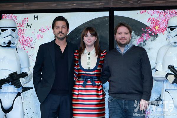 左からディエゴ・ルナ、フェリシティ・ジョーンズ、ギャレス・エドワーズ監督、映画『ローグ・ワン/スター・ウォーズ・ストーリー』来日会見にて