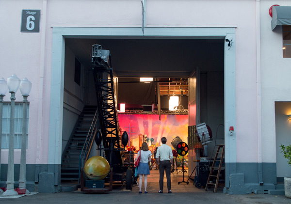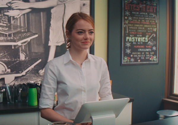 ミア(エマ・ストーン)がバリスタとして働く映画スタジオ内のカフェ内観は、映画のために作られたセット。
