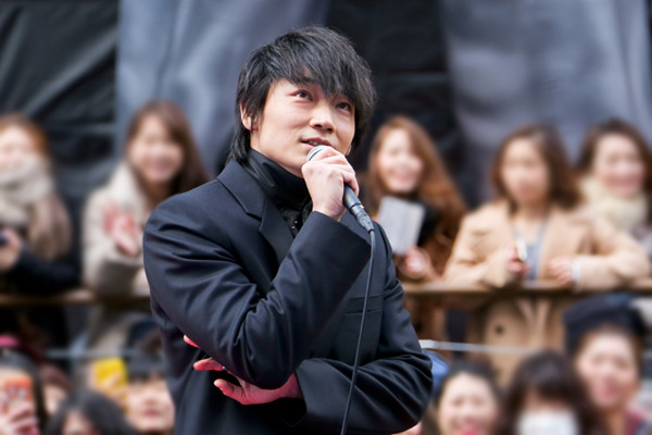 俳優の綾野剛が1月15日、大寒波で小雪が舞う中、主演映画『新宿スワンⅡ』の大ヒットを祈願して、大阪道頓堀にサプライズで登場するゲリライベントを行った。