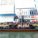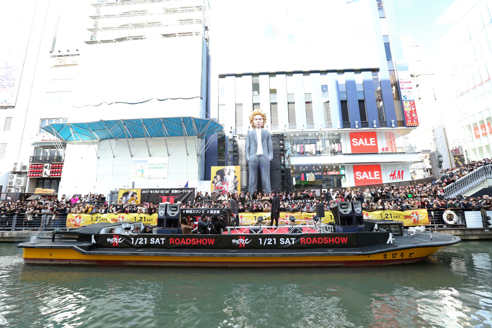 道頓堀川を船に乗って登場した綾野。大阪のファンの熱気に「大阪の人、あったかい!」と綾野も大喜び。「やっぱり道頓堀のグリコサイン凄いですね! これだけお客さんがいるとテンションも上がります」とテンションはあげあげ。そして「前回、龍彦像は新宿に設置されたんですけど、今回はどこにする?ってなったときに、大阪がいいってお願いしたんです!実際に見るとグリコサインの前に龍彦像が向かい合っていて何だか新参者で恐縮です!」と語った。