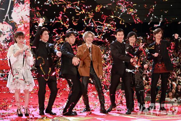 この日は菅田をはじめ、野村周平、竹内涼真、間宮祥太朗、志尊淳、千葉雄大、永野芽郁、永井聡監督が登壇。実は開演の合図が鳴ると、間宮祥太朗が役キャラで「本日は海帝祭(かいていさい)という完成披露試写会にご来場、誠にありがとうございます」と場内アナウンス。来場者には事前に打楽器の持参を呼びかけたそうで、持参しなくてもでんでん太鼓を配って、「合図で思う存分打ち鳴らしてもらいたい」とのお願いも。アナウンスにはキャストが代わる代わる登場し、当該ファンは敏感に、その声に反応しヨロコビの悲鳴をあげていた。さらに「お客様による撮影は一切禁止!・・・ではございません。撮影タイムを設けます」には場内が大騒ぎに!30秒間、ファンのための撮影タイムが設けられた。