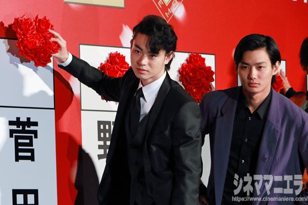 菅田将暉と野村周平は7年前に連続ドラマ出演で仕事をした仲。野村は「盛り上げ役が二人いる学園もの、っていうめんどくさい現場。(帝一の國で菅田と再共演し)改めて芝居のやりやすさを発見した」ことを語ると、菅田も「安心と信頼の野村周平!」と太鼓判。そして菅田は、「台本はありますけど、(野村と)二人のシーンは現場で生まれたもの」であり、演じた野心家・赤場帝一というキャラクターについて「目標のために一途な姿は支えというか、こうありたい(理想像)」だと明かした。