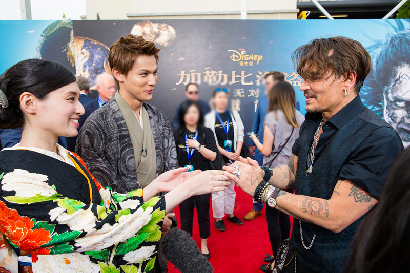 日本からは、本作の物語を握る女性天文学者カリーナ役の日本語吹替声優を務める栗山千明と、ウィル・ターナーの息子で、勇気ある情熱家ヘンリー・ターナー役の吹替を担当する中川大志さが着物で参加。ジョニー・デップは2人と対面し、「素敵な衣装だね、ずっと遠くから見えていたよ!僕も一着欲しいんだけど、どうすれば手に入る?(笑)」と2人の着物を大絶賛!そして、「今回の映画は、心の底から楽しんでもらえると思うよ 」と自信満々のコメント。さらに「早く日本の多くの皆様にも『パイレーツ・オブ・カリビアン/最後の海賊』を見てもらいたい。来月は日本に行く予定だよ!」と大興奮で握手を交わし、再会を約束した。