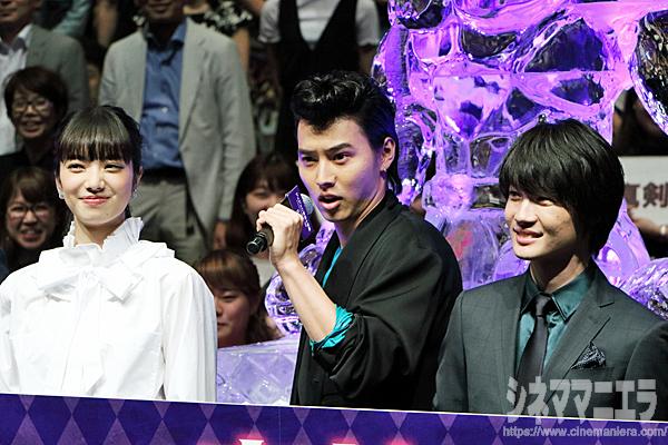 この日のプレミアは劇場公開前のたった一度の試写会であり、ステージには主演の山﨑賢人をはじめ、神木隆之介、小松菜奈、岡田将生、新田真剣佑、山田孝之、伊勢谷友介という主要キャスト、それに三池崇史監督が登壇した。登壇者による本作のオススメポイントはスタンドが現れるシーン。「現場では見られなかったスタンドに素直に感動しました」(山﨑)、「スタンドが戦う場面。女性が見ても興奮できるシーン」(小松)、「はじめてスタンドが出る、バルセロナで撮影したシーン」(神木)とキャストのイチオシだ。