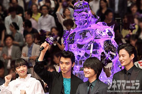 フォトセッションではご一行の背後に、日本の氷彫刻第一人者であるグランドプリンスホテル新高輪の小阪芳史さんが今回のプレミアのためだけに特別に製作した「クレイジー・ダイヤモンド」巨大氷彫刻が。キャストは大興奮で、岡田の携帯のカメラ機能で山崎と氷彫刻の姿を撮る姿や、新田、伊勢谷も自身のスマートフォンで自撮りする様子が見受けられた。