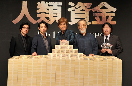[シネママニエラ]旧日本軍の隠し資産・M資金を題材にしたサスペンス大作『人類資金』の完成会見が丸の内のシャングリ・ラ ホテル東京にて実施され、主演の佐藤浩市、共演の森山未來と仲代達矢、そして監督の阪本順治、原作者で翻案も担当した福井晴敏が出席した。この日のフォトセッションは50億円に相当するレプリカとともに行われた。