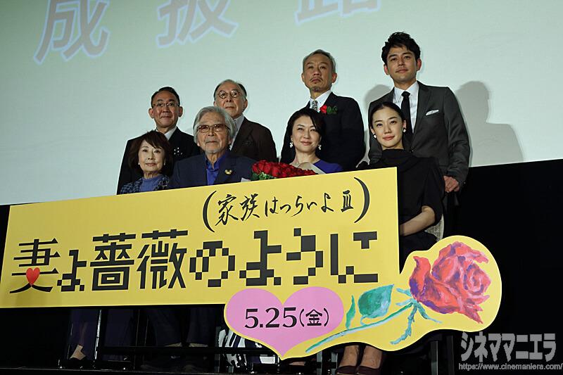山田洋次監督の最新作映画『妻よ薔薇のように』の完成披露試写会が3月22日に開催され、監督をはじめ、橋爪功、吉行和子、西村まさ彦、夏川結衣、林家正蔵、妻夫木聡、蒼井優が舞台挨拶に登壇。山田監督は「素敵なアンサンブルが生まれるのは幸せなこと」と監督冥利を述べた。