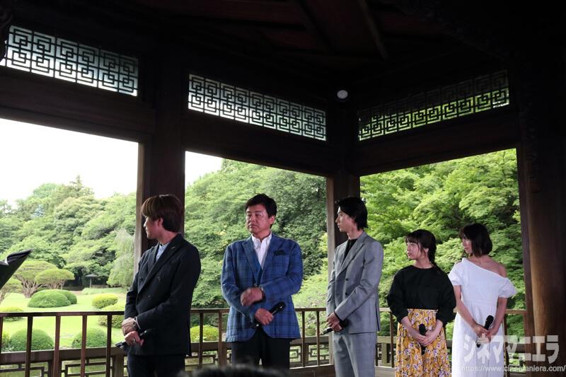 野外上映を前に、新宿御苑内にある東京都の歴史的建造物「旧御涼亭」(築91年だとか)にて行われた会見で山﨑は、「僕は今日初めて新宿御苑に来ました。すごく心地よい場所ですね。都会のど真ん中に、こんなに緑豊かな場所があるんですね。緑のあいだからビルが見えるのが不思議ですし、本当に素敵な場所です」と笑顔を見せる。そして「ずっとサッカーをやっていたので、土手の芝生で裸足で練習していました」と自然と自身の関わりを振り返った。