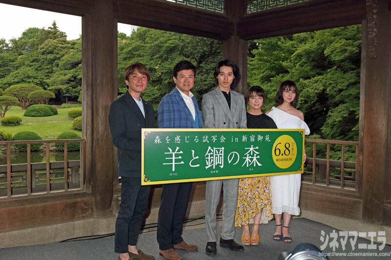 5月28日、映画『羊と鋼の森』森を感じる試写会舞台挨拶の実施前に、森を感じる会見が東京・新宿御苑「旧御涼亭」にて行われ、主演の山﨑賢人をはじめ三浦友和、上白石萌音、上白石萌歌、橋本光二郎監督が出席した。この日は新宿御苑にて初となる映画の野外上映会が開催されることにちなみ出席者の「初」が語られるなかで、山﨑と三浦は「新宿御苑を初めて訪れた」ことを述べた。野外上映舞台挨拶には山﨑演じる外村の職場の先輩を演じた鈴木亮平も駆け付けた。