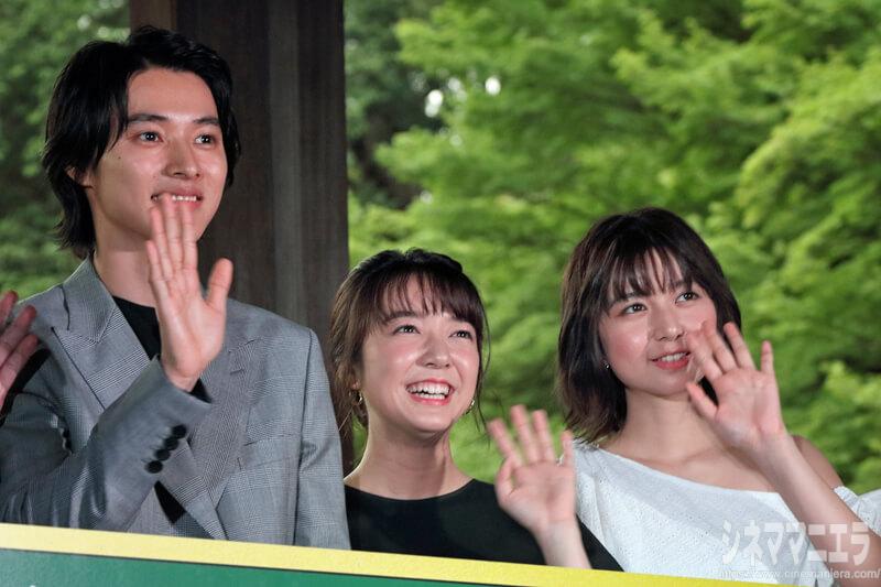 左から手を振る山﨑賢人、上白石萌音、上白石萌歌