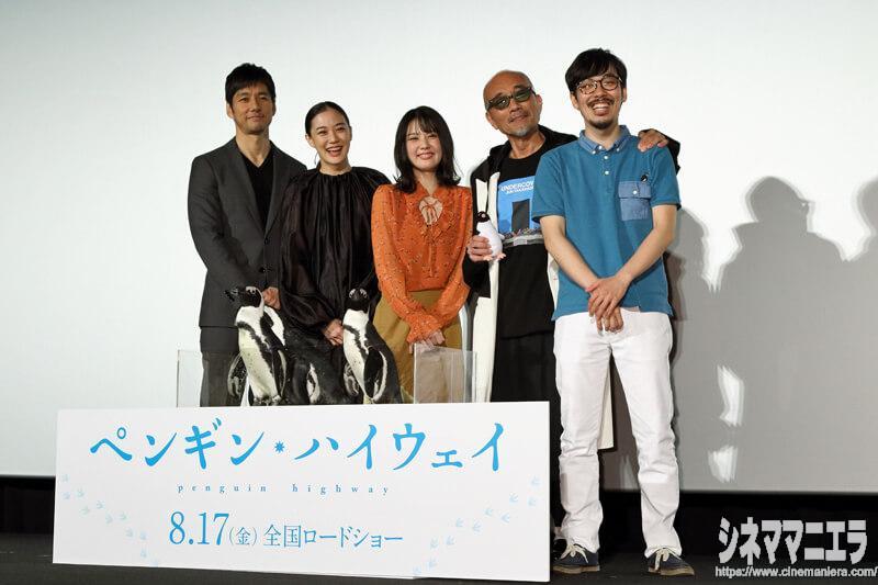 アニメーション映画『ペンギン・ハイウェイ』の完成披露舞台挨拶が7月3日に都内で行われ、北香那、蒼井優、西島秀俊、竹中直人、石田祐康監督が来場した。イベントの途中で本物のペンギンがサプライズ登場し、ご一行は大はしゃぎだった。