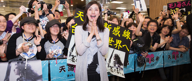 台風21号が猛威を奮う前夜に、日本に到着したユアン。この日、時間通りにイベントはスタート。まずは、森の中をイメージしたステージに、ユアンが登場! 木の幹にある穴から現れるのは、劇中のようです。