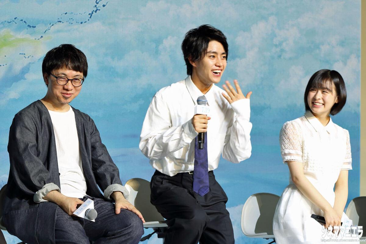 醍醐は「僕は出来上がった作品をまだ観ていないので、自分に対する評価はまだ分からないんですが、「新海監督に褒めていただけるのは、本当に幸せだな」って思います。ありがとうございます」と喜びも爽やかに、そして森も「嬉しいです。ありがとうございます。新海さんはアフレコの時も演出をつけてくださる時も優しい言葉をかけてくださいました。その新海さんの優しさに包まれた声が出せていると良いなと思います」と初々しくコメント。
