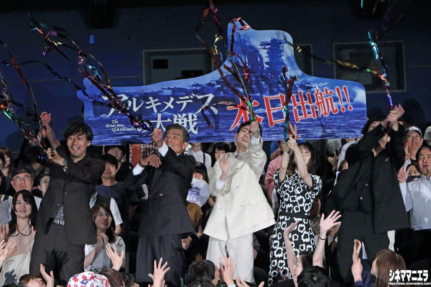 菅田将暉が7月26日、主演映画『アルキメデスの大戦』初日舞台挨拶に柄本佑、浜辺美波、舘ひろし、山崎貴監督と出席。戦艦大和の建造について帝国海軍の頭脳戦を描く本作の出航を笑顔で喜んだ。