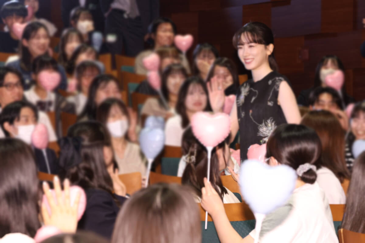 大人になった高木さん役の永野は、「本日は初めてお客様に見ていただくということで、この日を迎えることができて本当に嬉しく思っております」と挨拶し、母校で体育教師になった西片役の高橋は、「僕自身、映画を見て、西片、そして高木さんが作り出す空気が本当に存在するんだなぁと思いましたし、小豆島で全編撮影させていただいて、小豆島だからこそ出た西片の表情や2人の空気感もたくさん映画の中に散りばめられています」と述べた。