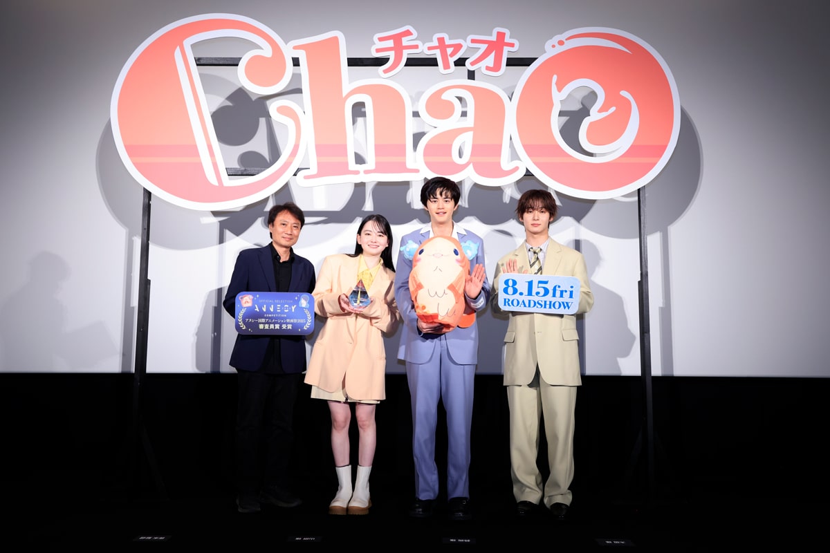 STUDIO4°Cの最新作のアニメーション映画『ChaO』(読み:チャオ)の魅力について、W主演を務めた鈴鹿央士、山田杏奈、そして共演の太田駿静(OCTPATH)がジャパンプレミアイベントで熱弁。舞台挨拶には青木康浩監督も登壇した。